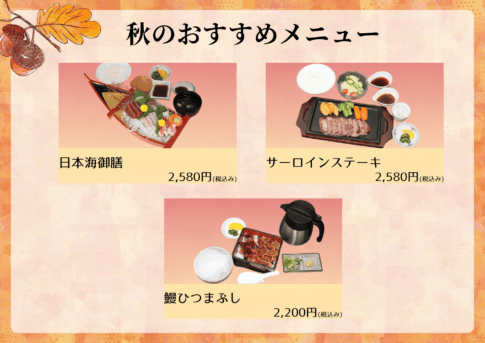 レストランからは日本海が眺望でき四季折々の風景が楽しめる。