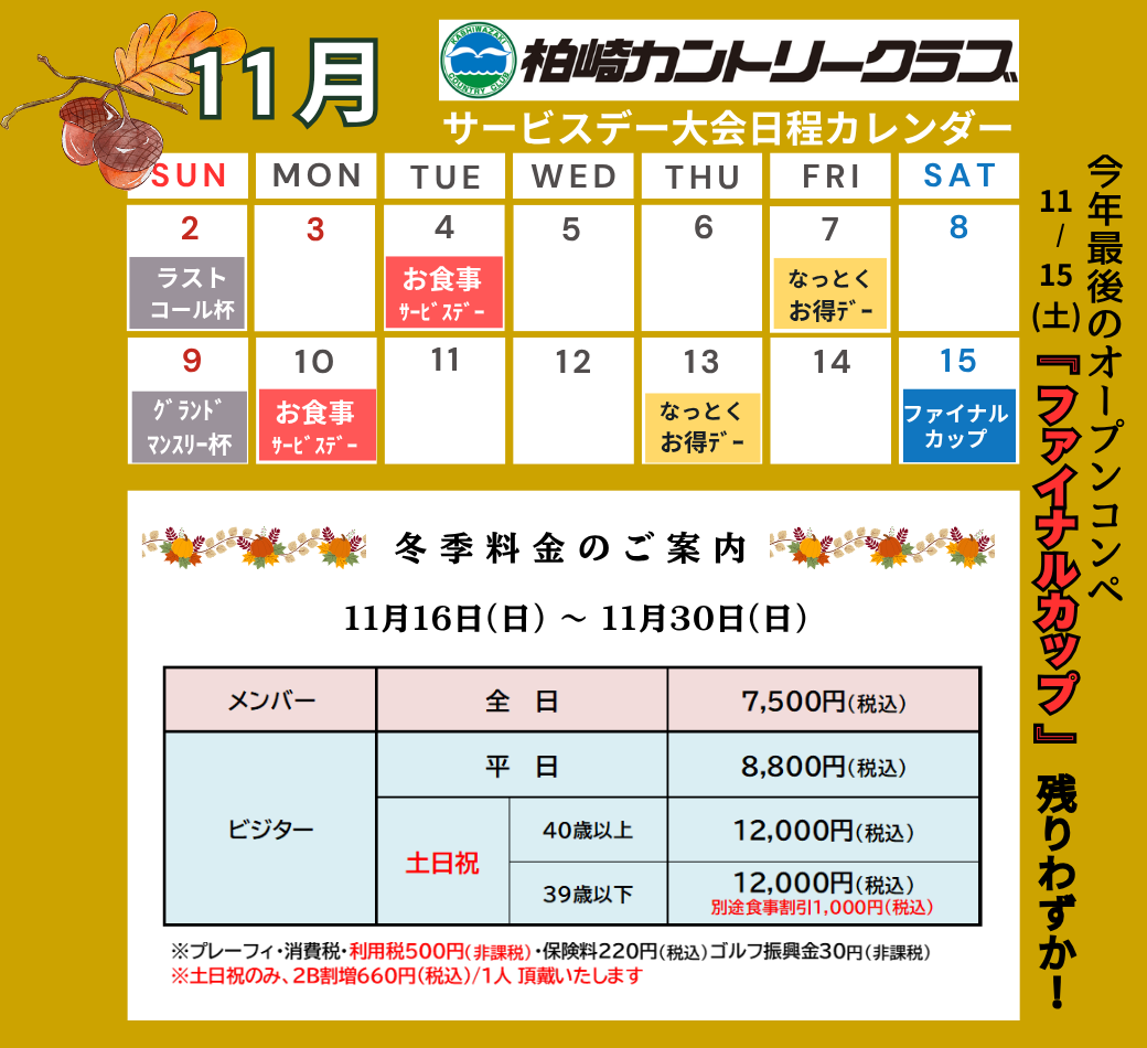 11月サービスデー・大会日程カレンダーと冬期料金のご案内です。